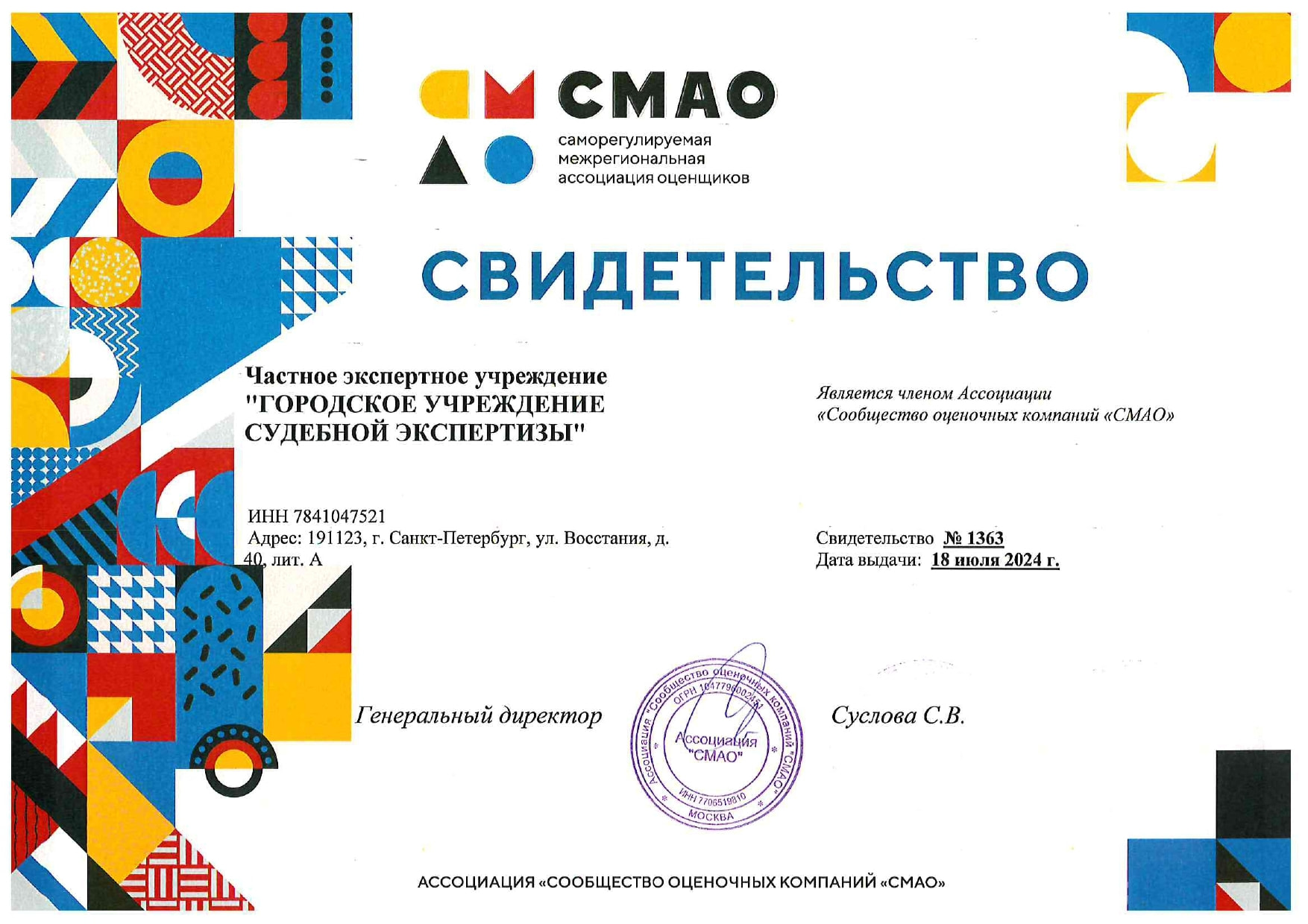 Свидетельство Саморегулируемой межрегиональной ассоциации оценщиков «СМАО»